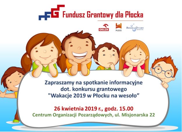 Fundacja Fundusz Grantowy dla Płocka ogłasza konkurs „Wakacje 2019 w Płocku na wesoło” 100 tysięcy złotych Fundacja „Fundusz Grantowy dla Płocka” przeznaczyła na organizację wakacyjnego wypoczynku dla dzieci i młodzieży z Płocka. W ramach projektu „Wakacje 2019 w Płocku na wesoło” o środki finansowe mogą ubiegać się instytucje pozarządowe. Spotkanie informacyjne z osobami zainteresowanymi dofinansowaniem…