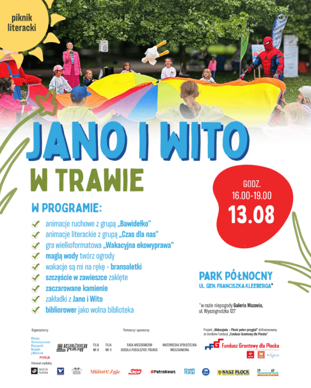 Już w najbliższą środę, 13 sierpnia 2025 r. o godz. 16:00, zapraszamy dzieci wraz z opiekunami na Piknik literacki „Jano i Wito w trawie”, organizowany przez Płockie Stowarzyszenie Przyjaciół Książki i Bibliotek. Wydarzenie odbędzie się w Parku Północnym. W przypadku niepogody zostanie przeniesione do Galerii Mazovia (przy aptece). Piknik jest częścią projektu „Wakacjada – Płock…