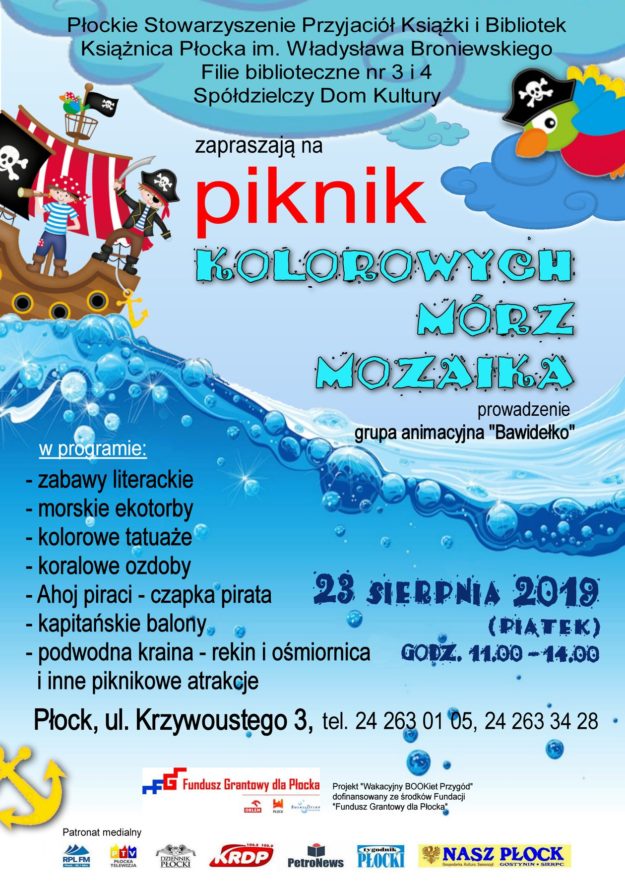 KOLOROWYCH MÓRZ MOZAIKA 23 sierpnia 2019 godz. 11:00 – 14:00 Płock, ul. Krzywoustego 3 Projekt w ramach „Wakacje 2019 w Płocku na wesoło” realizowany przez Płockie Stowarzyszenie Przyjaciół Książki i Bibliotek i Książnicę Płocką im. Władysława Broniewskiego