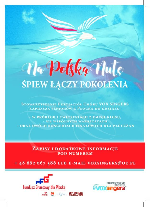 Serdecznie zapraszamy Seniorów z Płocka do wzięcia udziału w warsztatach wokalnych, które zostaną przeprowadzone pod okiem specjalistów – chórzystów. W ramach zajęć zostaną przeprowadzone warsztaty emisji głosu i wspólne próby przed koncertami w Płocku z chórem Płockiego Ośrodka Kultury i Sztuki „Vox Singers”. Koncerty już wkrótce! Realizatorem projektu „Na polską nutę – śpiew łączy pokolenia”…
