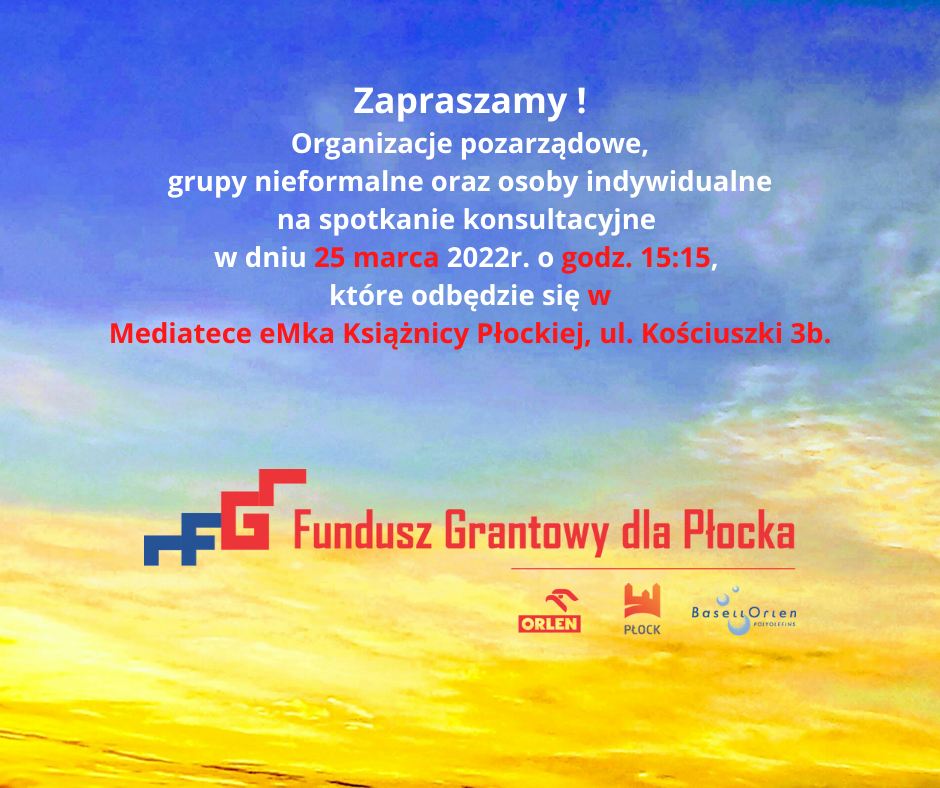 Serdecznie zapraszamy organizacje pozarządowe, grupy nieformalne oraz osoby indywidualne na spotkanie konsultacyjne w dniu 25 marca 2022r. o godz. 15:15, które odbędzie się w Mediatece eMka Książnicy Płockiej, ul. Kościuszki 3b.